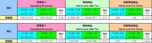 下方圖表是我整理的上市營建類股的財報分析表格,從表格資料來看,營建股的在 2012 年第一季的營收與盈餘表現皆快速的衰退中,顯見房地產市場並未如那些業者所言的好,反而因為股市表現不佳、央行管控房貸融資成數以及房地產奢侈稅的效應,導致房地產市場的急凍,因此建議打算在近期買房的朋友們,不仿再多看看、多比較一下,或是用力的給他殺價吧,我想這樣比較不會吃虧!